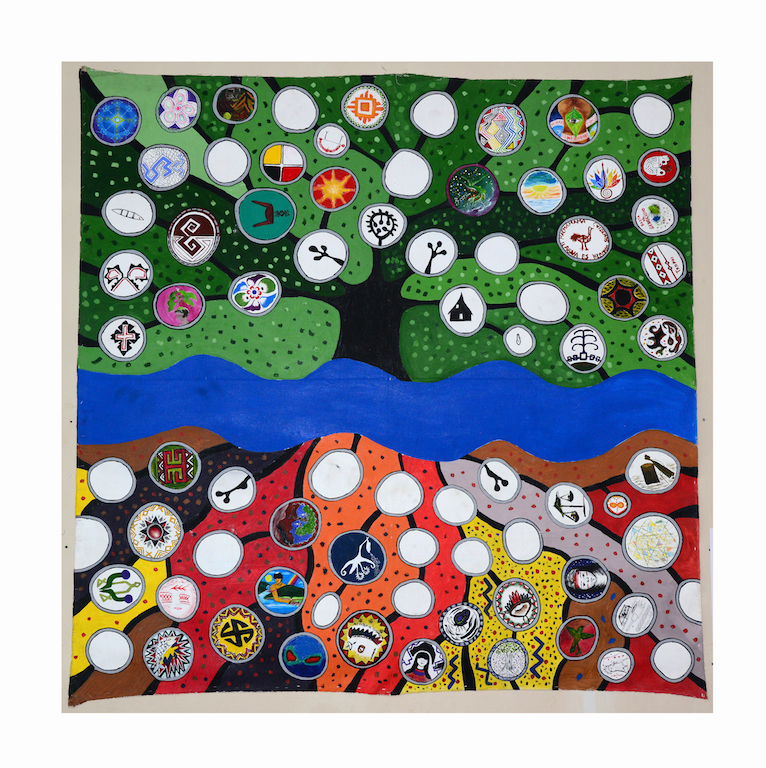 Proposto por Jaider Esbell em 2013, na Universidade Federal de Minas Gerais – UFMG – durante a exposição coletiva ¡MIRA! – Artes visuais dos povos indígenas. A coletiva foi uma produção de Maria Inês de Almeida e reuniu artistas indígenas do Brasil, Bolívia, Colômbia, Equador e Peru. Cada circulo na grande árvore tem uma assinatura cultural, que identifica um povo específico. O painel tem assinaturas de diversos povos da Amazônia, Américas e Estados Unidos. Em construção, a obra é a primeira de uma coleção de paneis com essa proposta para expor na ONU.